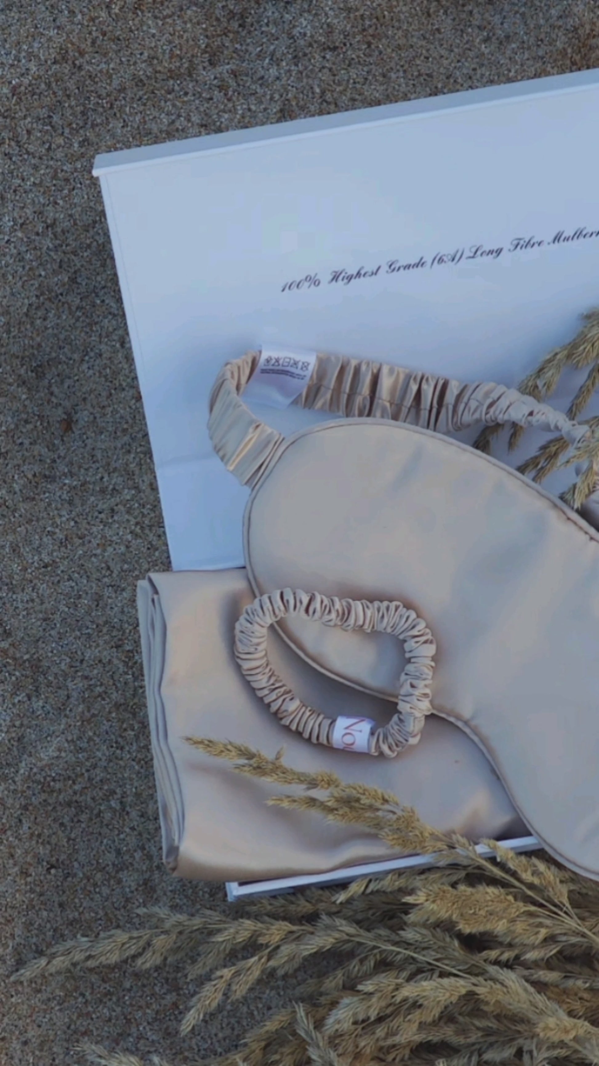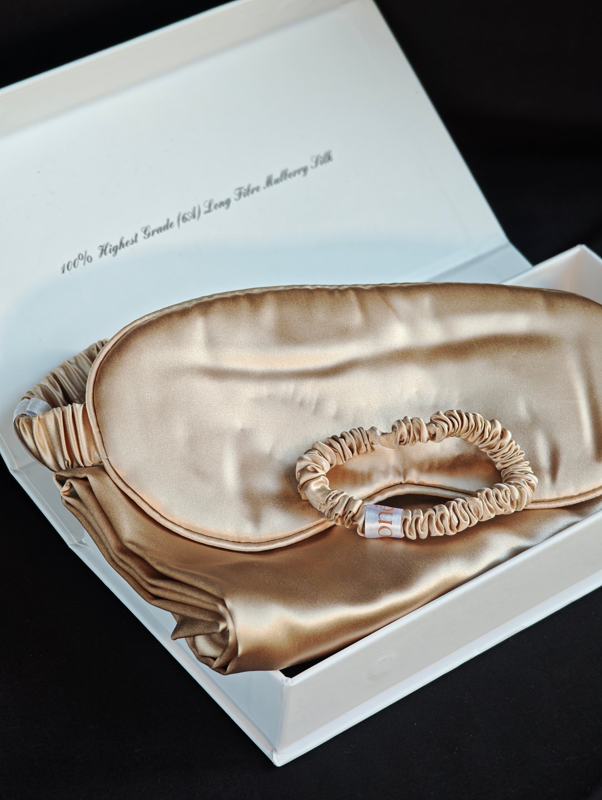 Šilkinis pagalvės užvalkalas, akių kaukė, plaukų gumelė.